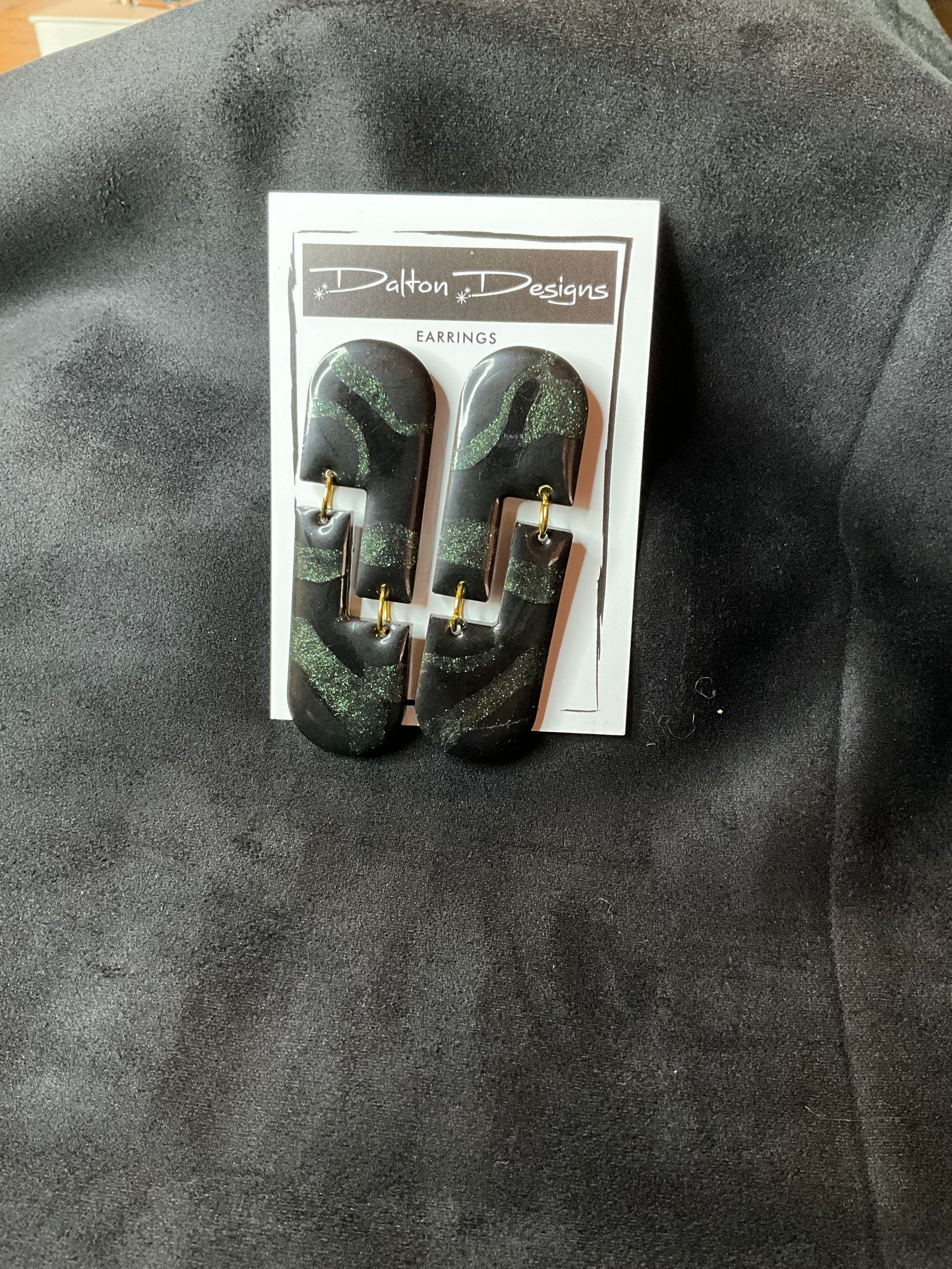Awesome stud backing earrings with a black background and shimmery green poured into it.