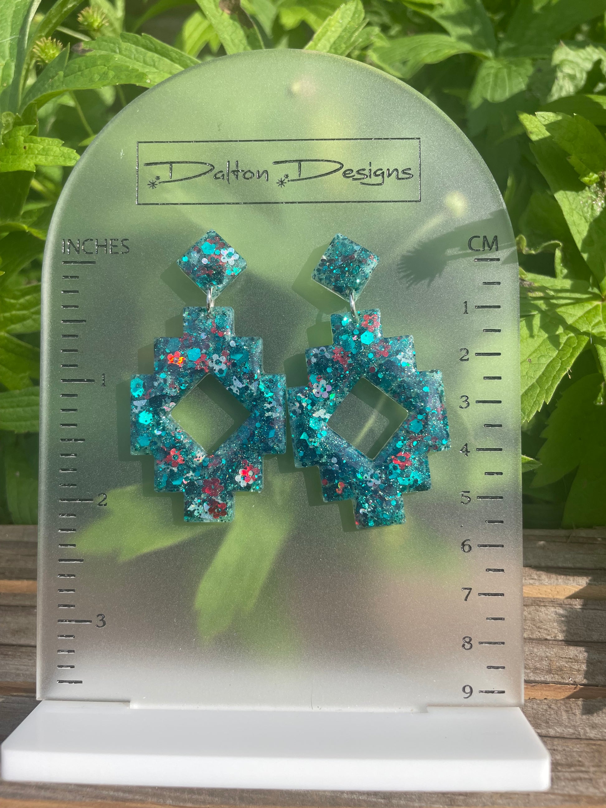 Dark Teal Chunky Glitter Mix Aztec Style Earrings. Stud Back