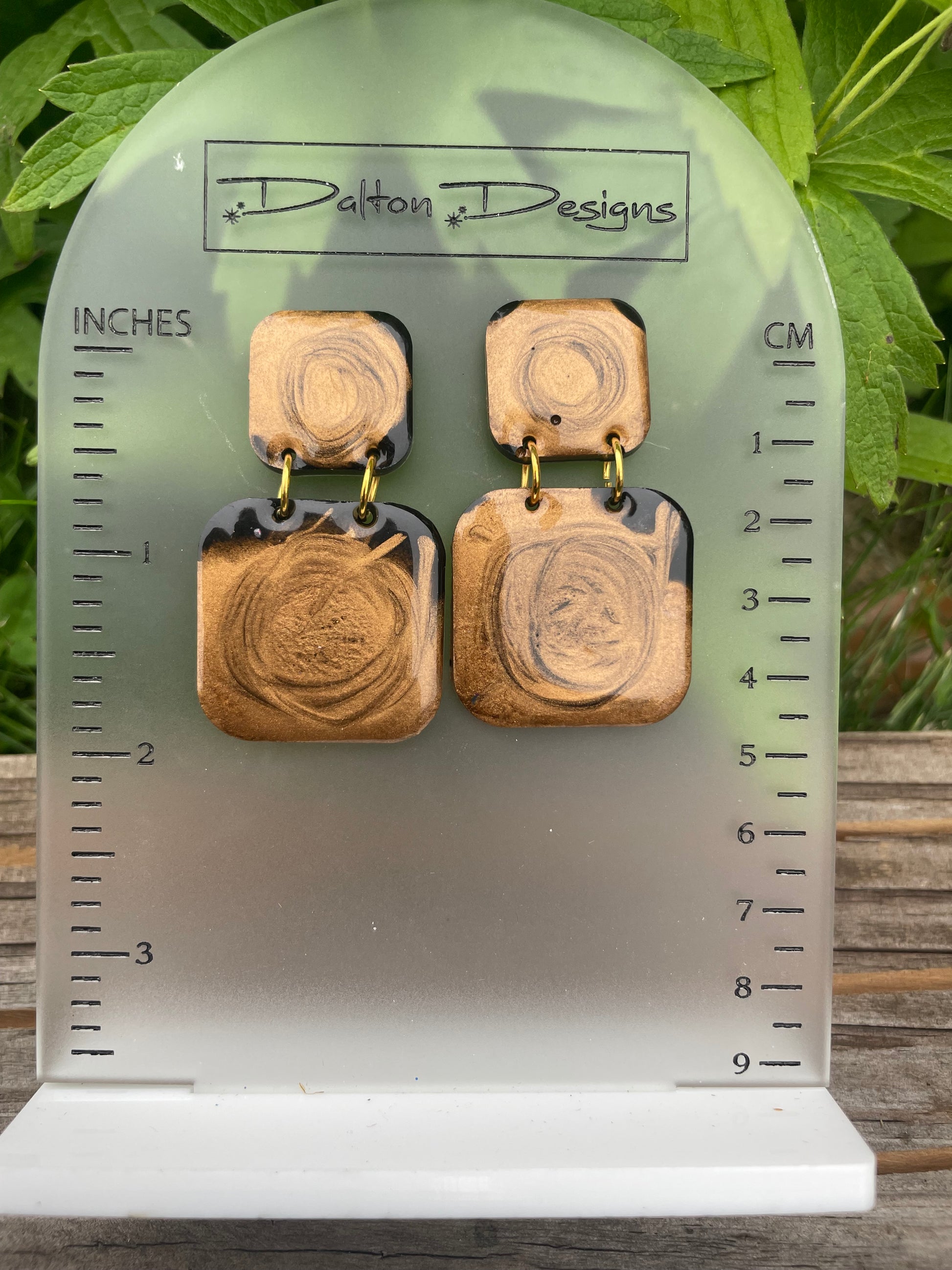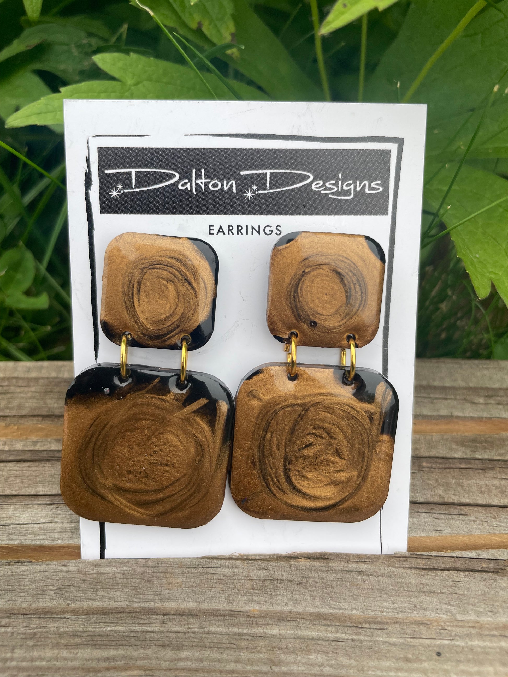 Gold shimmer resin swirl poured into a black resin base. Stud backing.