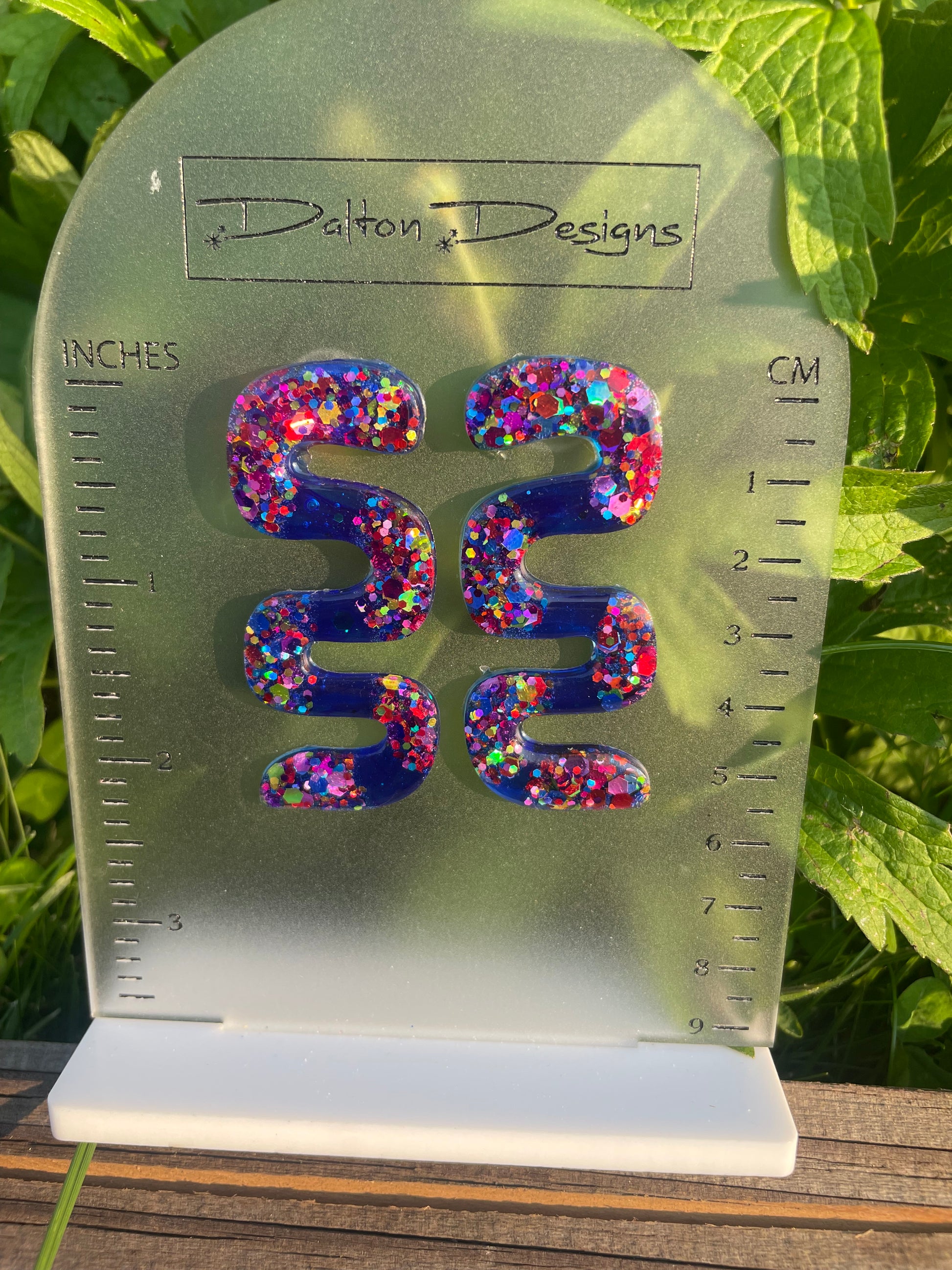 Blue Stained Glass one piece wave earring with multicolor chunky glitter. Stud backing
